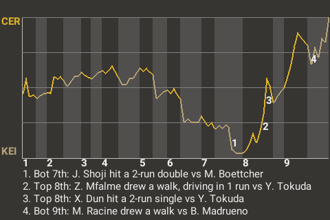The game was at a stalemate until designated hitter Fontana Maffeis came to bat in the top of the ninth. Facing Keiper pitcher Hyuk Ji, he hit a 1-0 slider for a run-scoring single. It was a game-changer, putting Ceres on top, 6-5.