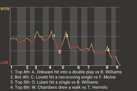 With scoring opportunities rare, the Dark Knights had to cash in when they had the chance. One such opportunity presented itself in the bottom of the fourth, when right fielder Charlie Lovett hit a run-scoring single. The single came off Fabrice Moine and made the score 1-0, Dark Knights. Lovett went 3-4 with 3 singles.