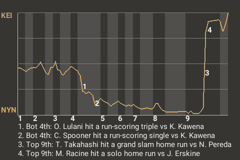 Takahashi had a timely hit for Keiper in the top of the ninth. With Keiper trailing 3-0, he turned a 1-2 cutter into a grand slam home run. It was his 7th home run of the season, making it 4-3, Keiper.