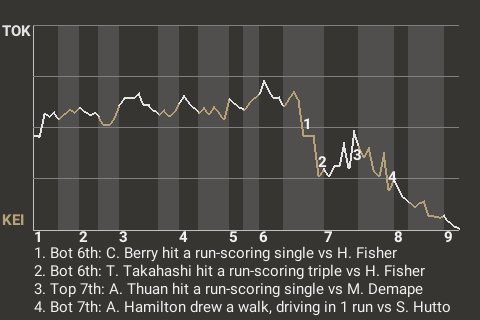 The Keiper Krakens converted a terrific effort from starter Meynard Demape into a win over the Tokyo 99ers at Kraken Grounds. The Krakens won the game by a final score of 4-2. The winner was Demape. He threw 7.0 innings allowing 2 runs. The loser was Henry Fisher. The win lifted the Keiper record to 26-15.