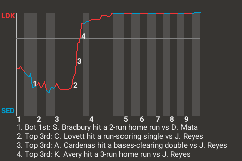The Lunar Dark Knights clobbered the Sedna Supernovas, 12-2, at Supernova Stands. Leading the onslaught was Seon-jong Ko. He was 2-4 with a home run and a walk, while scoring 2 and driving in 3 for Lunar. Dan Mata picked up the win, improving his season record to 4-2. He struck out 5 in 7.1 innings. Sedna has now lost 4 straight.
