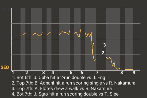Seoul Suns starter Ryosaku Nakamura hurled his team past the Umbriel Shadows, 6-2. Nakamura, the winner, moves to 2-0. He threw 7.1 innings of 4-hit ball, while fanning 2 and giving up 3 walks. Kaipo Keola got credit for the save for Seoul. It was his 17th of the year.