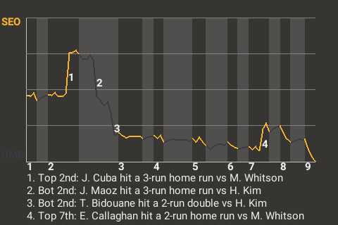 2 (9, 2nd Inning off H. Kim, 2 on, 2 outs; 5th Inning off H. Kim, 0 on, 0 outs)
