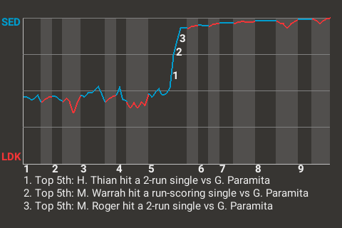 Sedna left fielder Hong-quan Thian contributed a timely at-bat in the top of the fifth. With two down, he hit a cutter to center field for a 2-run single. It was his 45th hit of the season and put the Supernovas ahead, 2-0.