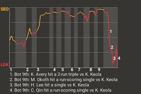 The performance of Masnsen Okoth proved critical in helping Lunar beat Seoul, 6-5. The Dark Knights center fielder went 4 for 5 with a triple, a double, and 2 singles, while scoring 2 times. The victory puts Lunar at 24-35.