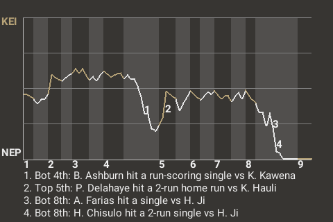 2 (4, 5th Inning off K. Kawena, 0 on, 0 outs; 8th Inning off H. Ji, 3 on, 1 out)