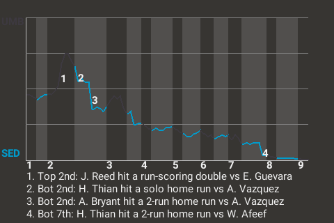 The Supernovas got a big at-bat from third baseman Aaron Bryant. For the game, Bryant was 1-4 with a home run. He drove in 2 runs and scored once. In the bottom of the second, with a runner on 1st, he stroked a 2-run home run. His 5th home run of the season gave Sedna a 3-2 lead.