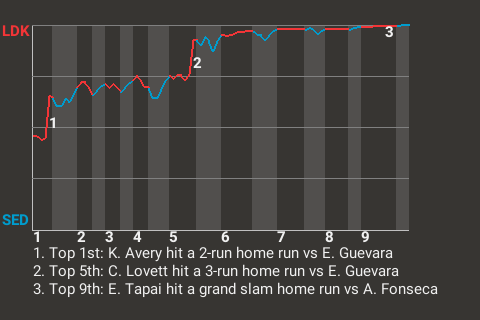 With Lunar leading 2-0 in the top of the fifth, Lovett hit a cutter from Efrain Guevara for a 3-run home run. It was his 11th home run of the season and put the Dark Knights ahead, 5-0.