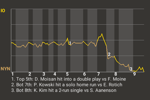 Moine, the winner, is now 9-4, after putting the clamps on the Io offense. In 8.1 innings of work, he gave up 1 run on 3 hits, while collecting 5 Ks.