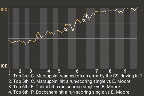 Carmelo Marsuppini, who is tied for 10th in the in extra base hits with 6, had a direct impact on the outcome. Marsuppini contributed a run-scoring single in the top of the fifth inning to put Sicily up, 2-0.